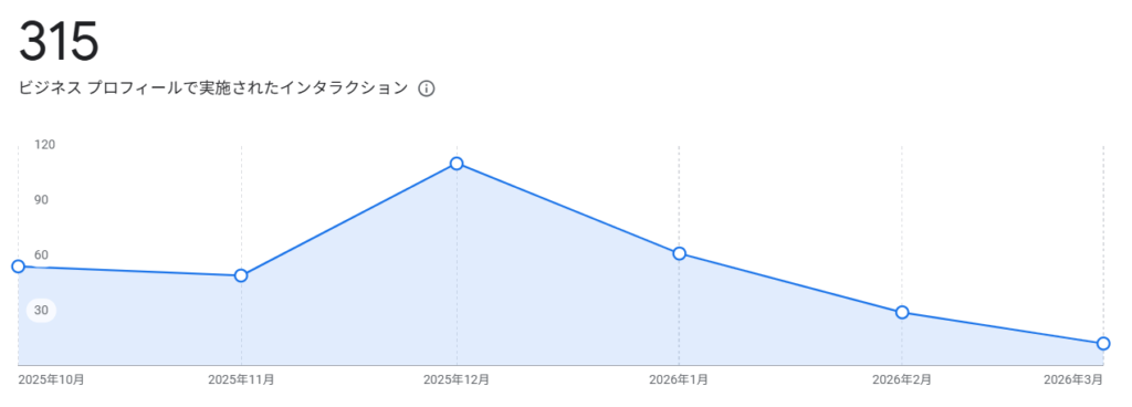 MEO対策の単体で見ると、「そんなに多いか?」という感じですが、月に約50回ぐらいは何かしらのアクション(HPを見る・電話・ルート検索など)を行っていただけている証拠です。